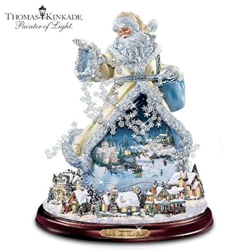- Meticulously handcrafted of artist's resin, this three-dimendional Thomas Kinkade tabletop Santa figurine depicts Santa Claus' enduring kindness and holiday spirit; masterfully hand-painted to exhibit Santa's winter white ensemble, rosy cheeks, his blbue bag of silvery snow flakes, and the festive decorations on the village church and homes